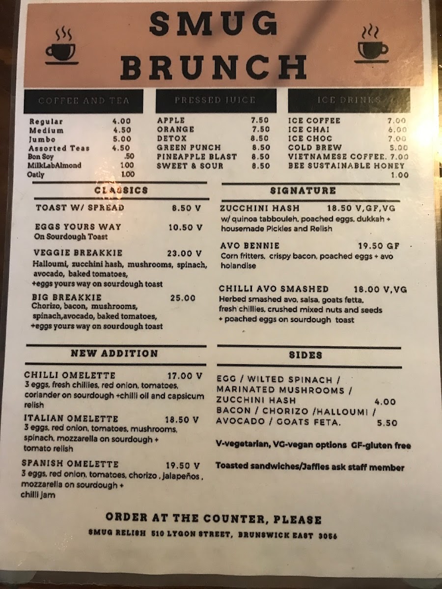 Smug Relish, located at 510 Lygon St, Brunswick East VIC 3057, offers a delightful and diverse menu that caters to a variety of tastes. For those seeking a satisfying brunch, their Brunch Menu features a selection of specialty coffees, including the Mocha, Long Mac, Long Black, and Chai Latte, as well as the Magic for a smooth, rich coffee experience. If you prefer something cooler, there are refreshing Cold Drinks like Iced Long Black, Iced Mocha, and Vietnamese Iced Coffee, perfect for those warmer days.